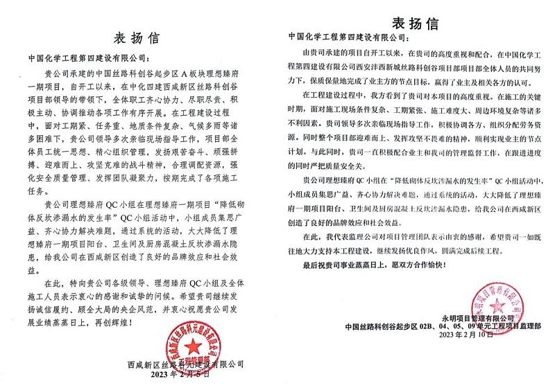 近日,華東公司收到西咸新區絲路科元建設有限公司和永明項目管理有限公司發來表揚信,對華東公司承建的中國絲路科創谷理想臻府一期項目保質保量完成節點目標以及在“降低砌體反坎滲漏水的發生率”QC小組活動中所做出的成績,給予表揚和感謝。
