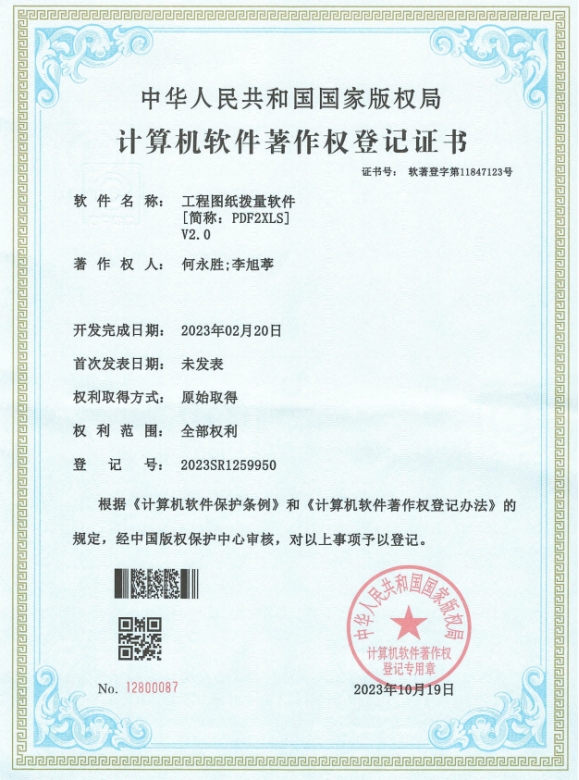 近日,公司取得由國家版權(quán)局頒發(fā)的《工程圖紙撥量軟件》著作權(quán)登記證書。這是公司繼《企業(yè)短信群發(fā)系統(tǒng)》《企業(yè)外經(jīng)證業(yè)務(wù)管理系統(tǒng)》后獲得的第3項計算機(jī)軟件著作權(quán)登記證書。