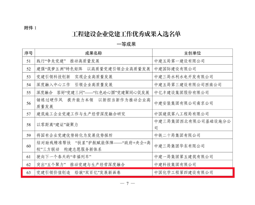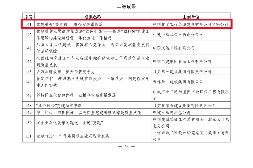 5月27日,從中國施工企業(yè)管理協(xié)會(huì)傳來喜訊,公司選送的黨建案例《黨建引領(lǐng)價(jià)值創(chuàng)造 繪就“雙百億”發(fā)展新畫卷》獲評(píng)2024年工程建設(shè)企業(yè)黨建工作一等成果,市政工程公司選送的黨建案例《黨建領(lǐng)航品牌紅 市政先鋒譜華章》和華南公司選送的黨建案例《黨建引領(lǐng)“粵向前” 融合發(fā)展譜新篇》獲評(píng)二等成果。