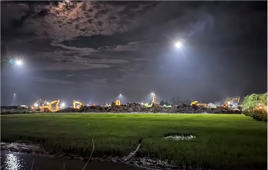 因第三道防線地處岳陽市君山區(qū)良心堡鎮(zhèn)一個小村落,基礎(chǔ)設(shè)施極不完善,施工面臨村內(nèi)稻田、水塘、溝渠縱橫,高壓線、照明線架設(shè)高度不夠,搶建期間社會車輛、搶險車輛密集通行,土方石方須遠距離運輸?shù)痊F(xiàn)實困難,公司不等不靠,多方協(xié)調(diào)、創(chuàng)新方法,有效克服了大型機械進場難、場內(nèi)交通組織難、土方石方調(diào)配難、安全管理執(zhí)行難等難以想象的困難,比預(yù)期提前8個小時實現(xiàn)堤壩合龍。