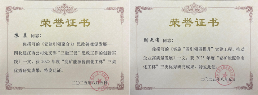 此次公司獲得的2項三類優秀研究成果分別為:第一分公司(原江西公司)蘇晨撰寫的《黨建引領聚合力 思政鑄魂促發展——四化建江西公司黨支部“三融三促”思政工作的創新實踐》論文和華南公司周天有撰寫的《實施“四引領四提升”黨建工程,推動企業高質量發展》論文。這2項研究成果緊密圍繞新時代國有企業黨建與思想政治工作面臨的新形勢、新任務,結合公司基層黨建和項目思想政治工作的具體實踐,分別從黨支部特色工作法和黨業融合角度,深入總結了公司推動思想政治工作與生產經營深度融合的有效路徑和創新模式,具有較強的實踐價值和借鑒意義。