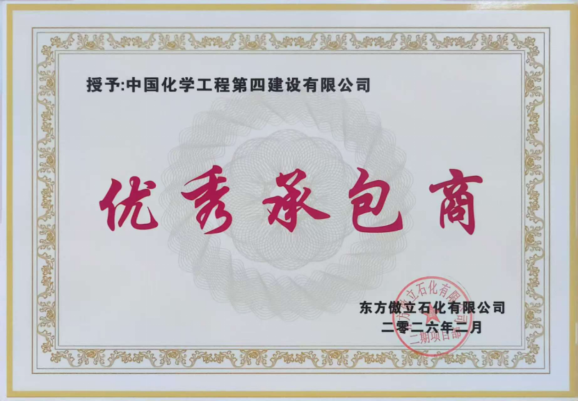 近日,在東方傲立石化有限公司舉行年度評選中,東北公司憑借在海南東方傲立石化項目中的高效履約和優質協作,被授予“優秀承包商”稱號。