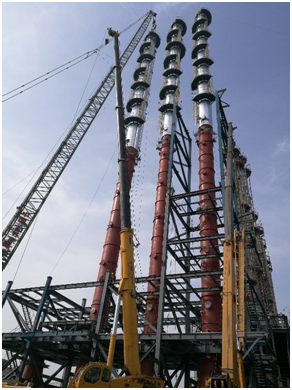 3臺精餾塔的吊裝就位標(biāo)志著該工程正式進入施工關(guān)鍵階段,管道、設(shè)備等各專業(yè)施工作業(yè)全面進入高峰期。