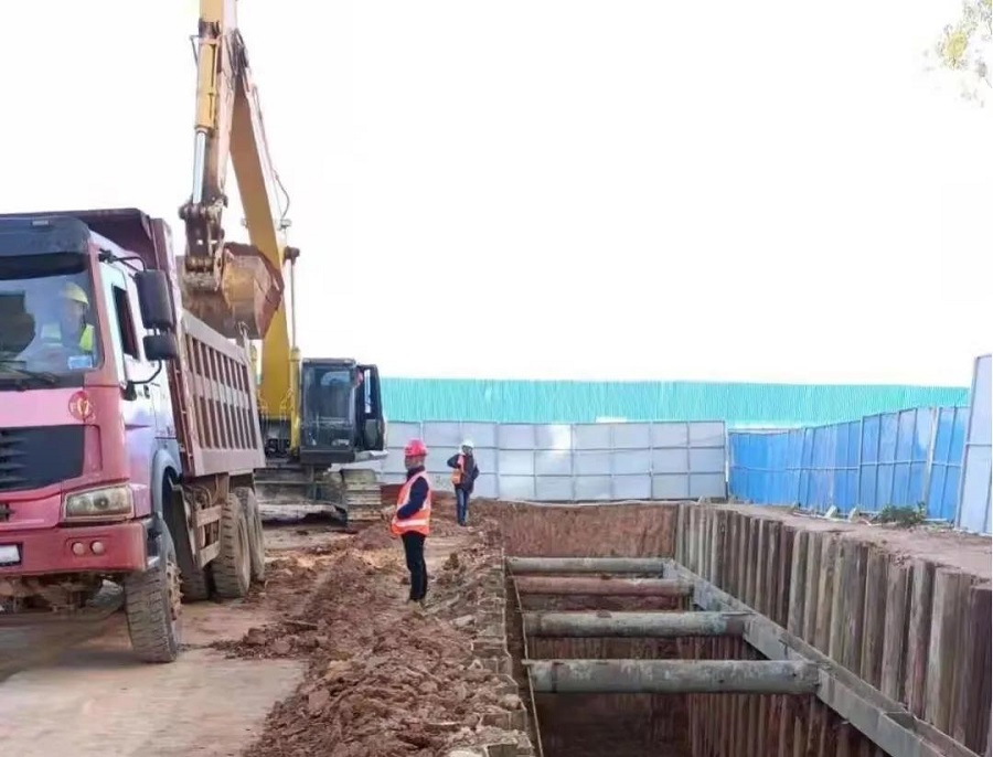 該工程為桔林路新建雨水管道,末端接入楊家壟路預(yù)留雨水檢查井,待建楊家壟路、虎形山路、蓮花路雨水管道完工后,可暢通湖濱大道雨水的排水出路,有效解決湖濱大道長期積水問題。中南分公司項目部已于2021年10月底進(jìn)場,并完成封圍擋與施工現(xiàn)場清表工作;進(jìn)入11月后,相繼開展旋挖引孔及鋼板樁施工。截止11月29 日,中南分公司片區(qū)已完成引孔4000米,鋼板樁施工3600米,溝槽開挖60米,并安排部署雨水混凝土涵管及污水克拉管安裝作業(yè)。