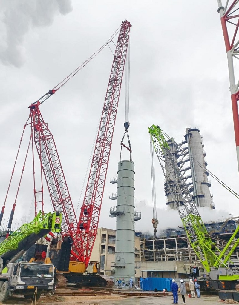 該設(shè)備重量為120.6噸、筒體直徑4.6米、高28.29米,是項(xiàng)目的核心設(shè)備,屬大型吊裝作業(yè)。為確保安全順利完成吊裝,項(xiàng)目部編制了專項(xiàng)施工方案和措施,對(duì)現(xiàn)場(chǎng)全體施工人員進(jìn)行了安全技術(shù)交底。在吊裝過程中,項(xiàng)目施工一線人員嚴(yán)格按照方案施工,努力克服吊裝工作場(chǎng)地狹小、工序多、技術(shù)要求高的不利影響,緊密協(xié)作、共同努力,整個(gè)吊裝過程有條不紊,實(shí)現(xiàn)了一次吊裝成功。