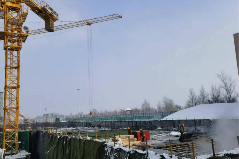 該項目所處新疆烏魯木齊,冬季施工時溫度已達零下,且隨時面臨氣溫驟降的可能,工期十分緊張。為安全、高效、高質量完成目標,項目部提前策劃,精心部署,發揮黨員示范帶頭作用,經過60余小時的攻堅奮戰,分兩次完成了此次筏板澆筑工作。同時,為防止冬季施工凍融現象對周邊既有結構及基坑內部造成不良影響,項目部在筏板四周及中間部位搭設暖棚及蒸汽暖氣包,澆筑時嚴格控制砼入模及成型溫度,及時覆蓋薄膜,并在砼初凝后覆蓋棉被確保混凝土質量。