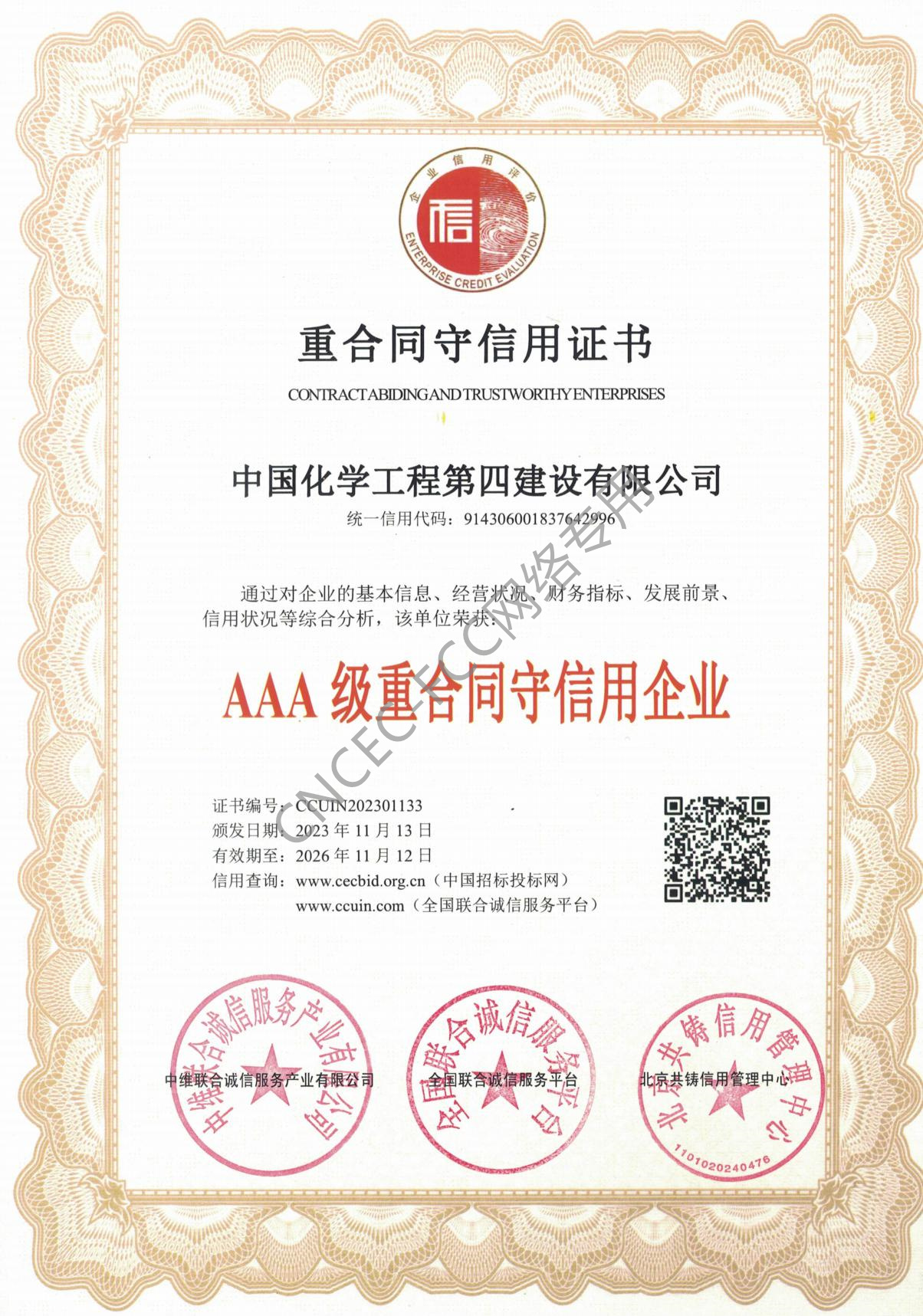 AAA級重合同守信用企業證書